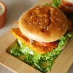 Burger bun per chutney dal ker salad patta,grilled chicken fillets,pyaz,tomato ketchup aur tamatar slices rakh dein.