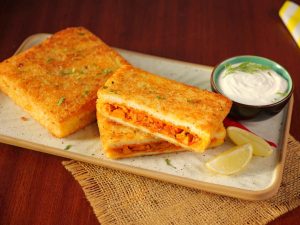 -Add prepared chicken tikka mixture, spread it, cover with another bread slice, press with spatula.