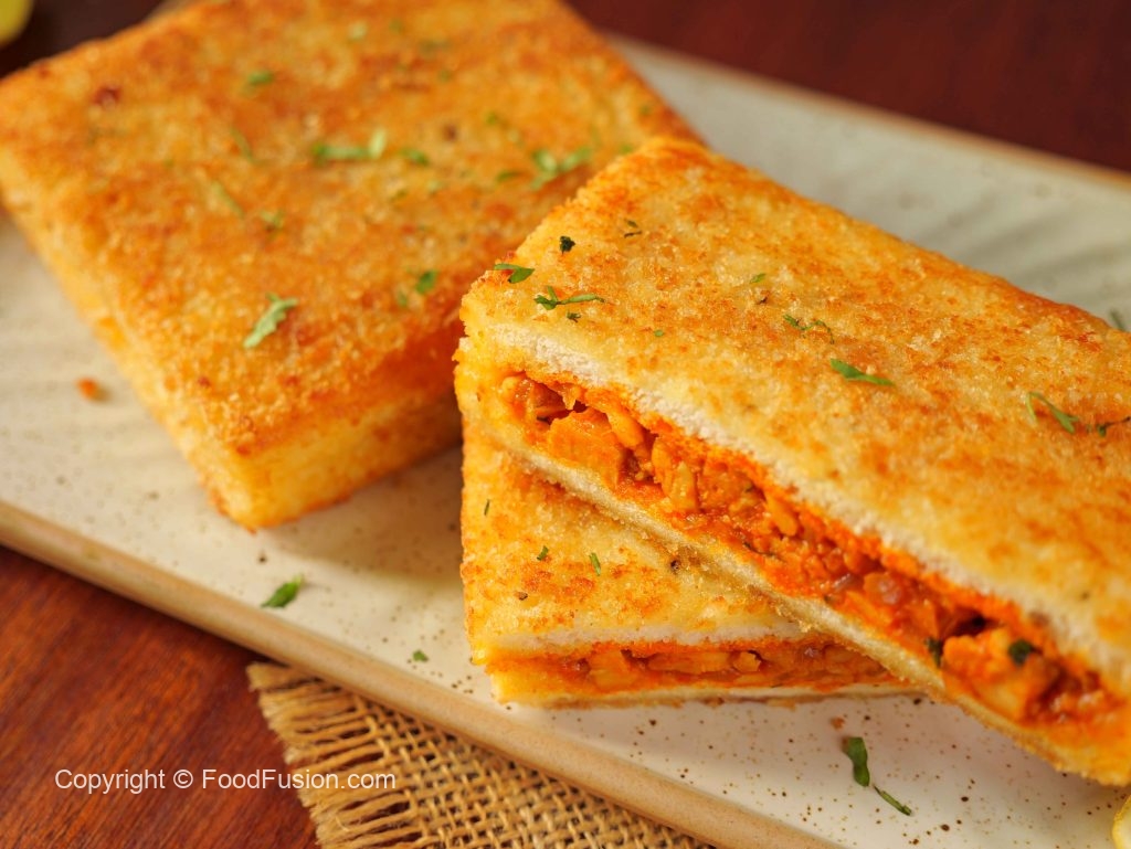-Aik bread slice par tayar chicken tikka mixture dalein aur evenly spread karen, doosri bread slice se cover karen aur spatula se press karen.