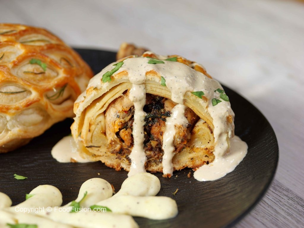 -Chicken wellington ko mustard sauce aur mashed potatoes ke saath serve karein.
