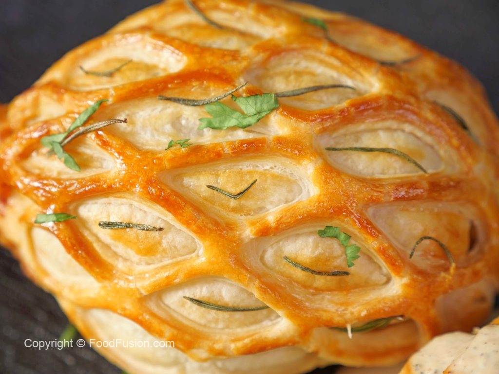 -Plain puff pastry par bologna slices rakhein, upar steamed chicken rakhein, phir fold kar ke chicken ko puff pastry mein wrap kar lein. Corners par egg wash laga kar achi tarah seal kar lein aur upar se doosri puff pastry se coat kar dein.