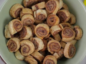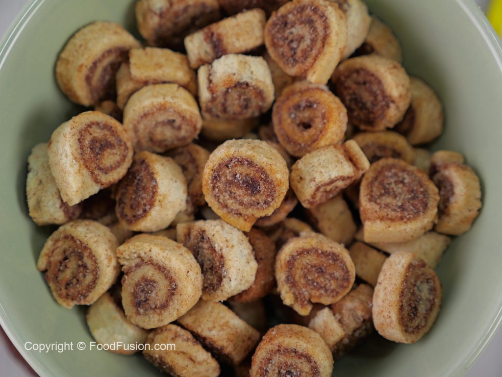 -Apply chocolate spread & roll up then cut into bite size (pinwheel shape) & coat well with cinnamon & sugar mixture.