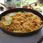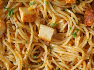 -Add boiled spaghetti, mix well, add cooked chicken cubes, mix well.