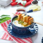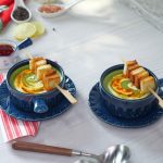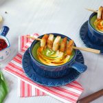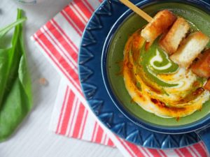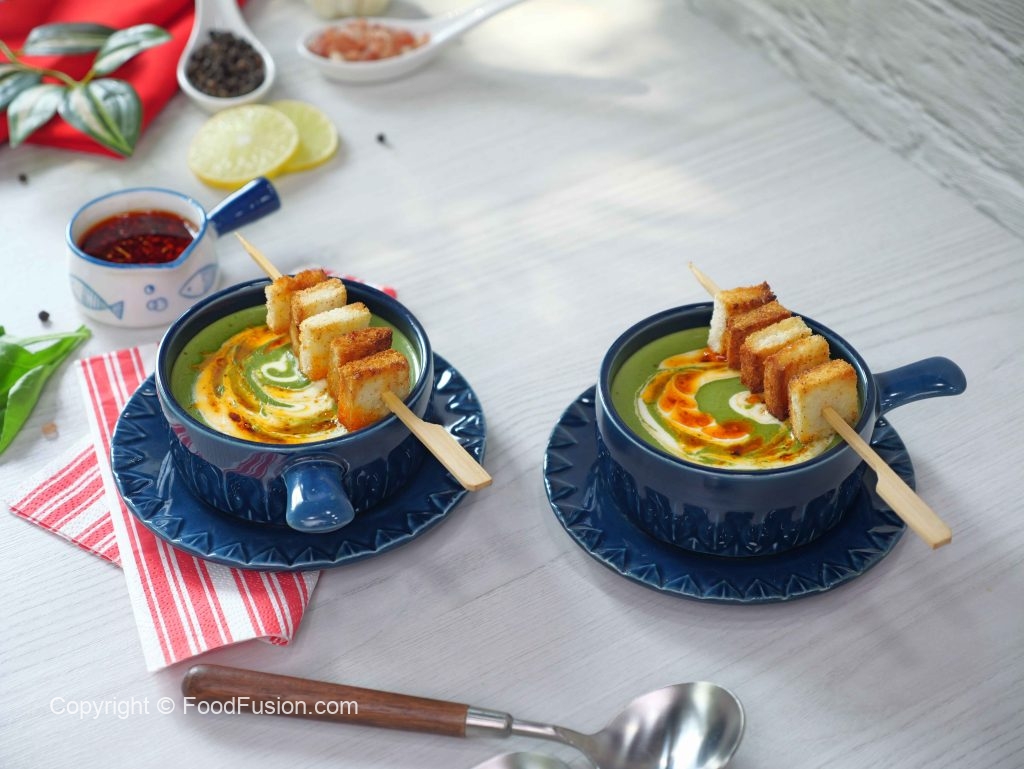 -Serving bowl mein cream of spinach soup dal kar cream aur chilli oil se garnish karein aur croutons ke saath serve karein!