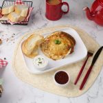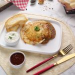 -Serving plate mein fried potatoes,fried cheese egg,hara dhania & hari mirch dal dein,French bread,sour cream & chilli garlic sauce ka saath serve karein!