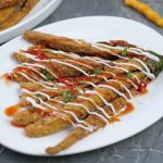 -Baingan ki strips ko clean working surface per rakh ka pheela lein aur tayyar seasoning ko sprinkle ker lein.