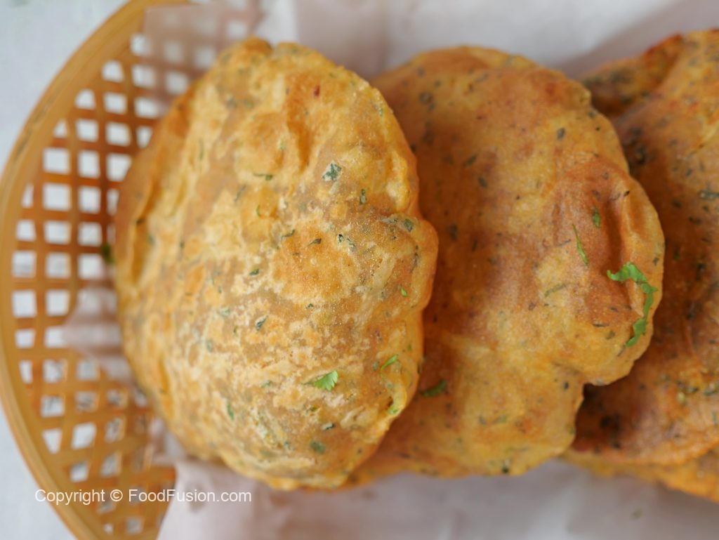 -Dry flour se dust kar ke, rolling pin ki madad se roll karen aur 5 inches ki puri bana lein. (13–14 puriyan banti hain)