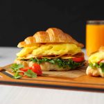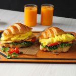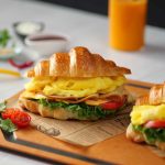 -Toasted croissant par tayyar sauce,salad patta,tamatar slices,cheddar cheese slices,mortadella slices aur scrambled egg rakh kar doosra croissant upar se rakh dein (makes 2).