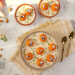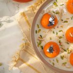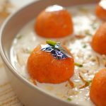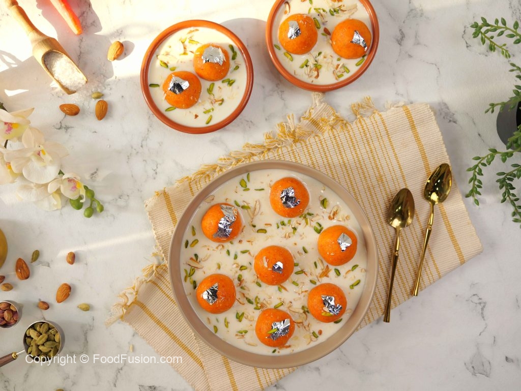 -In a serving dish, add prepared rabri doodh, prepared carrot jamun, garnish with edible silver leaf, pistachios, almonds & serve!