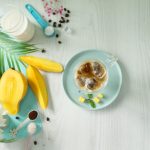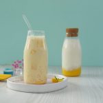 -Glass mein mango puree (2-3 tbs),ice cubes,tayyar milk mixture (1/2 Cup) aur dissolved coffee (2 tbs) dal ker ache tarhan mix ker lein & serve karein!