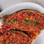 -Peel eggplants alternatively from the skin lengthways & prick with fork (don’t remove the head).