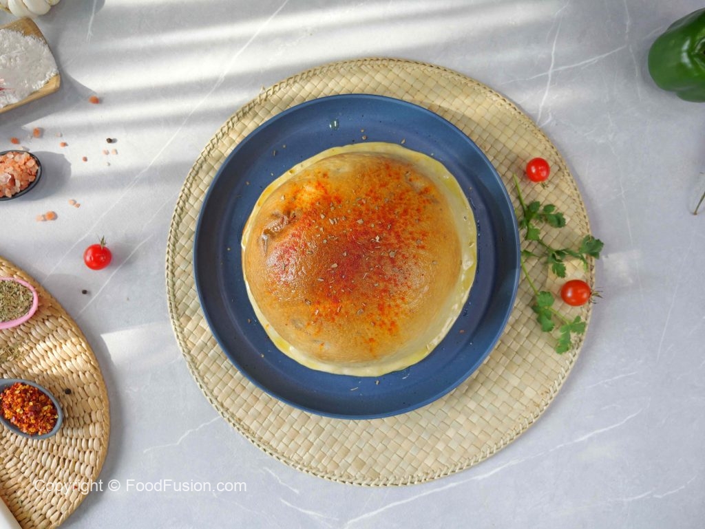 -Place rolled dough on a baking paper, add cheddar & mozzarella cheese, pizza sauce, cooked chicken, capsicum, tomato, corns, olives, jalapenos, oregano, red chilli crushed, apply water in corners, (place straw at one side of the rolled dough ensuring the tip reaches center), cover with another rolled dough (80g), gently press the corner.