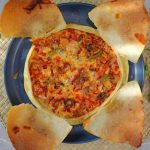 -Rolled dough ko baking paper par rakhain, cheddar aur mozzarella cheese, pizza sauce, cooked chicken, shimla mirch, tamatar, corn, olives, jalapenos, oregano aur crushed lal mirch dalein.