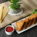 Pat dry lasagna strips with kitchen tissue paper,fold and make a pocket,add mince stuffing in the center,add mozzarella cheese & mince stuffing and roll into the shape of samosa triangles.