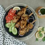 Marinated chicken ko wooden skewers per laga lein (makes 9-10).
