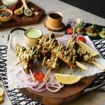 Marinated mutton ko wooden skewers per laga lein (makes 11-12).