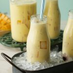 Serving bottle mein mango jelly cubes,tayyar doodh aur badam dal dein.