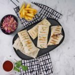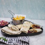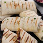 -On a tortilla, add cooked chicken, coleslaw, teriyaki glaze, grilled pineapple, sesame seeds, spring onion leaves, fold & roll up.