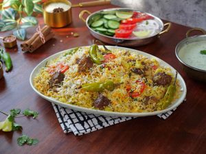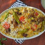 -Remove the cover of beef, mix well, add tomato slices, fresh coriander, mint leaves, half of boiled rice, prepared dahi mirch, half of leftover boiled rice, tomato slices, saffron essence, orange food color, & clarified butter.