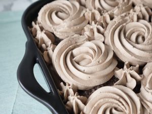 Cake ko refrigerator sa nikal lein aur mocha frosting laga lein.