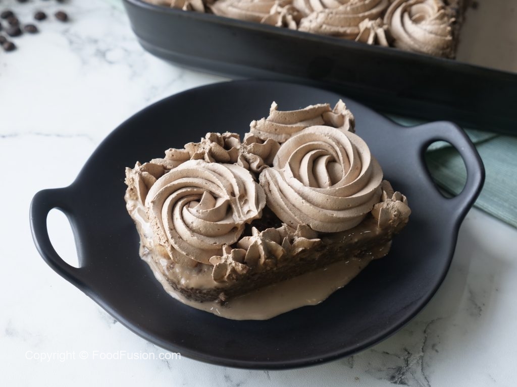 Wooden skewer ki madad sa cake ko poke ker lein aur tayyar mocha milk ko cake ka upper dal ker holes ko fill ker lein,cling film sa cover karein aur 4 hours kliya refrigerator mein rakh dein.