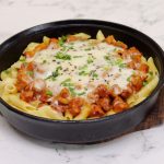 In a cast iron pan,add penne pasta,cooked chicken,mozzarella cheese,spring onion leaves,black & white sesame seeds,cover & cook on low flame until cheese melts (4-5 minutes).