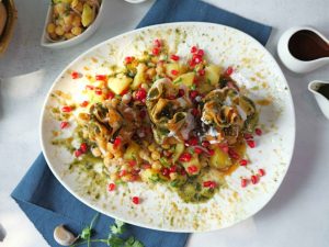 -In a serving platter,add prepared tamarind chutney,green chutney,yogurt,chana mix,potli samosa,pour yogurt,tamarind chutney, green chutney,pomegranate & serve!