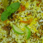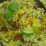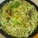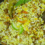 Lastly topped the rice with ghee, kewra essence, water, milk+food color and 2 tbsp of fried onions and cover the lid.