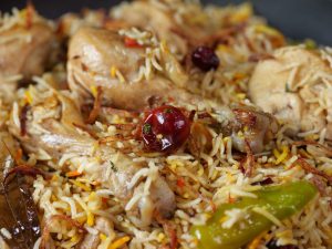 -Green chillies, orange food color, fried onion, lemon slices, fresh coriander, mint leaves dalain, phir kitchen cloth aur lid se cover kar ke dum par 10-12 minutes paka lein.