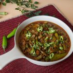 In a wok heat oil, add onion, okra, green chilies, mix well and fry them for 5-6 minutes on high flame or until golden brown. Takeout and set aside.