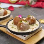 -Heated small cast iron pan mein gulab jamun,tayyar garam rabri,pista aur badam dal dein aur rose petal sa garnish ker ka serve karein!