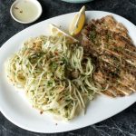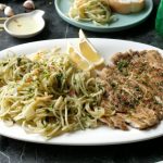 Sprinkle fresh parsley & red chilli crushed & serve spaghetti with grilled chicken & 7up.