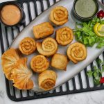 -On roll sheets add prepared filling & spread it evenly along the length,fold & seal with the help of flour slurry then fold it into a pinwheel shape & seal with flour slurry.