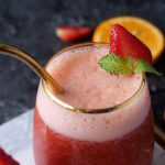 In a blender jug add fresh strawberries, honey, fresh orange juice, crushed ice & blend well.