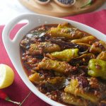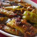 Slid green chillies and stuffed with prepared achar masala & set aside.