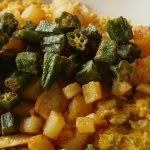 On serving plate,add egg mixture,fried potatoes,fried okra & serve!