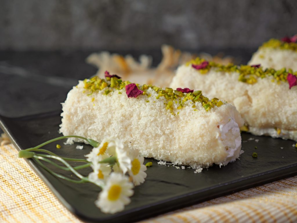-Ek (11x11 inches) tray ko butter se grease karen, upar se desiccated coconut chhidk dein aur side par rakh dein.