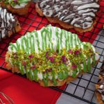-On a croissant,add & spread cream frosting,pistachio ganache,pistachios & garnish with dry rose petals (makes 6).